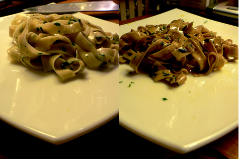 A következőnek a vargányást választottuk, ami nemcsak, hogy barna színű volt, hanem barnás foltok terjengtek benne. Már főzés közben kiderült, hogy a barna foltok valódi vargányafoszlányokat rejtenek, az időre már nagyon figyeltünk és 3 és fél perc tényleg elég is volt. Beleforgattuk a serpenyőben várakozó petrezselymes-fokhagymás olajba, és az egész nagyszerű volt. Ehhez megtaláltuk a tökéletes minimálszószt – ami végül is nem furcsa – a gombához is ilyesmit szokás adni. Ez a tészta nemcsak, hogy nagyon finom volt, de azonnal átláttam, mennyire hasznos. Nem kell ugyanis gombát venni, és úgy is lehet gombás tésztát készíteni. Ennek olyan erős és kellemes gombaíze volt, mintha én tettem volna bele gombát.
