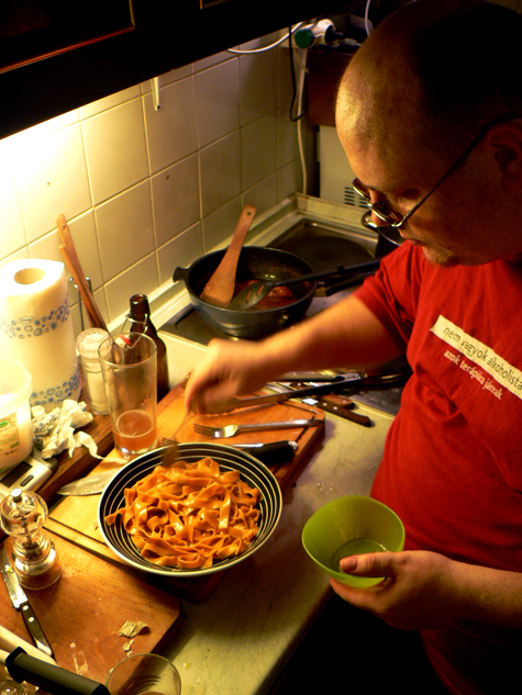 Horasz hívott meg magához egy főzésre abból az alkalomból, hogy egy kollegájának a valakijének a valakijének a valakijétől kapott egy csomó kézműves tésztát, és meg kellene kóstolni, mit tudnak, úgyhogy este hétkor a sűrűn kavargó márciusi hóesésben becsöngettem a nyolcadik hetedik kerületi bérház kapuján.