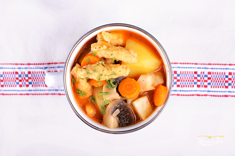 Elkészítés: A vöröshagymát kockázom, és olajon, egy lábosban megdinsztelem. Megszórom két evőkanál liszttel, édes őrölt paprikával, összekeverem a megdinsztelt hagymával, majd felöntöm egy liter vízzel. Szórok bele sót és borsot. Megvárom, amíg a víz elkezd forrni, addig a zöldségeket megtisztítom, darabolom, és a leveshez adom. A maradék lisztet és egy tojást összekeverem, és kanállal a levesbe szaggatom. Pár percig főzöm a levest a galuskával is, majd elzárom alatta a tüzet. Ha szükséges, még fűszerezek rajta.