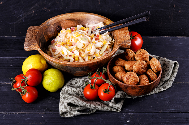 A tojásokat megfőztem. A sárgájukat kivettem. A fehérjét szeleteltem, és egy nagy tálba tettem. Az almát megpucoltam, és csumáztam, majd a tojás sárgákkal együtt egy konyhai robotgépben pürésítettem. Hozzákevertem a majonézt, és sóztam. A paradicsomot kockáztam, a káposztát vékony csíkokra vágtam, az uborkát szintén aprítottam. A tojásfehérjével összeforgattam, majd adtam hozzá ecetet. Hozzáöntöttem a kukoricát is, majd leöntöttem a tojáskrémmel, és azzal is átforgattam. Kóstolás alapján sóztam még. Fasírttal tálaltam.